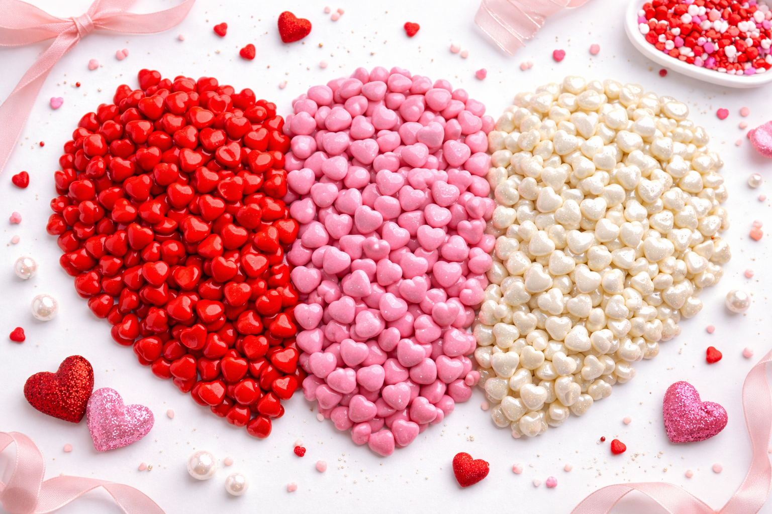 Los sprinkles en forma de corazón blanco, rojo y rosado para San Valentín son una decoración comestible esencial para repostería creativa durante la temporada más romántica del año.